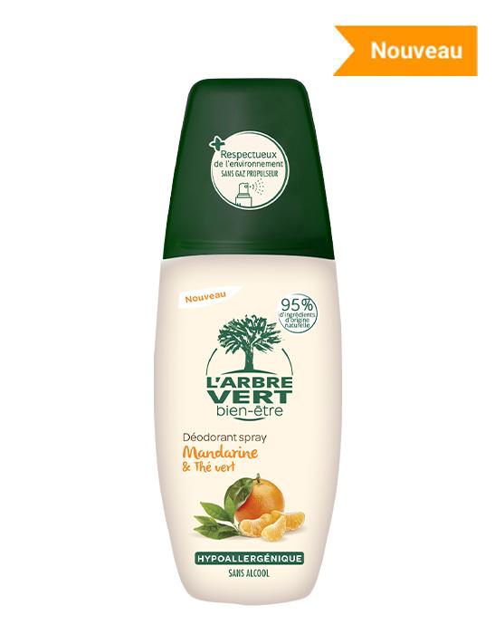 Le déodorant spray Mandarine et Thé Vert dispose d'une formule respectueuse de la santé et de l’environnement avec 95% d’ingrédients d’origine naturelle, Hypoallergénique.