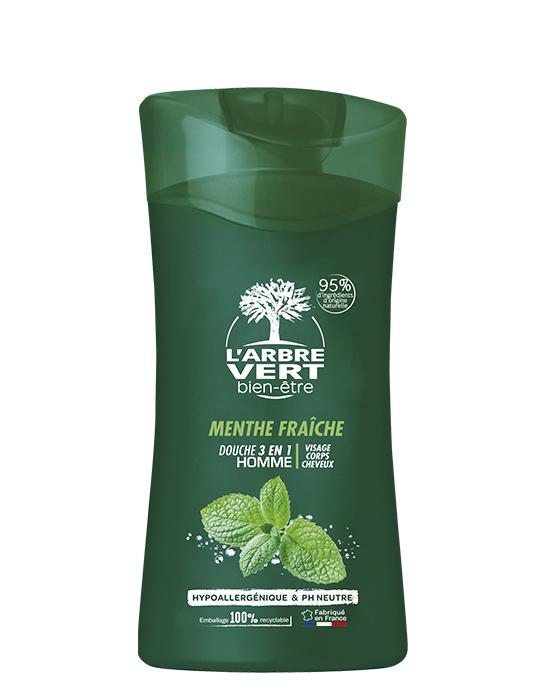 La douche 3 en 1 pour hommes L’ARBRE VERT bien-être est parfaitement adaptée pour se laver en un seul geste, des cheveux aux pieds en passant par le visage. Avec sa formule composée à 95 % d’ingrédients d’origine naturelle, elle est hypoallergénique, au pH neutre.